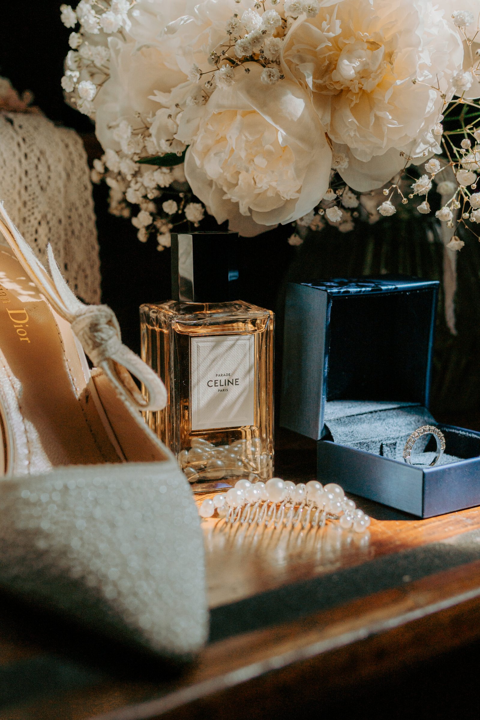 Bijoux, alliances, parfum, chaussures, cravate, nœuds papillons de vos témoins… parfois une bouteille de Gin, ou de Rhum, parfois une idée spontanée. Tous ces éléments, choisis avec soin, se retrouvent réunis dans une image douce, comme un écrin de souvenirs.